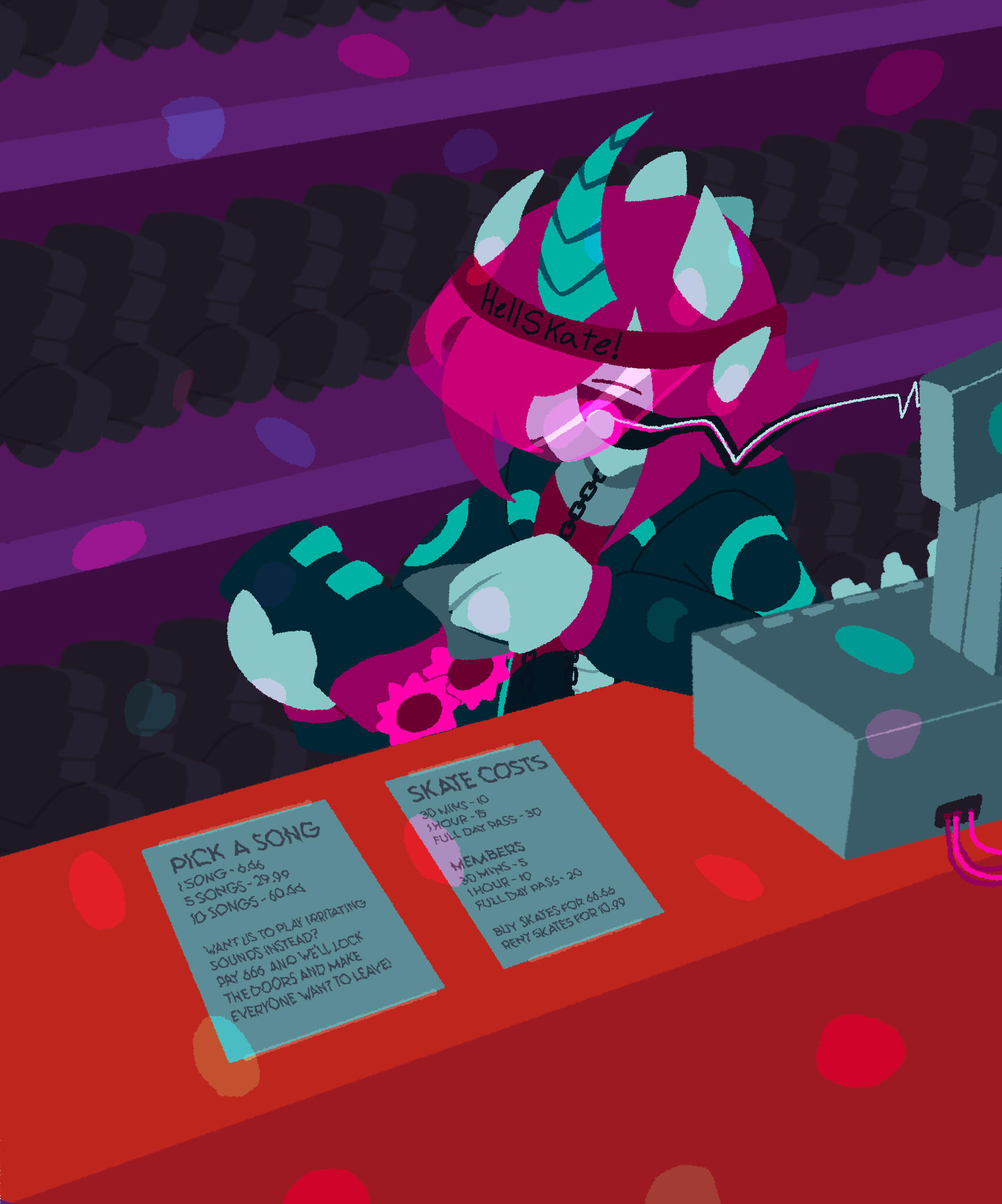 Fruit club is a work in progress comic about a mystery in Eclipse Academy, a high school for magical monsters far out in space. It centers around a young nonbinary teenager named Lemon who loves to explore and is determined to learn more about the abandoned basement floors of the school they attend. In the process they team up with their best friends Strawberry and Cherry and meet a large cast of other characters that attend the school.